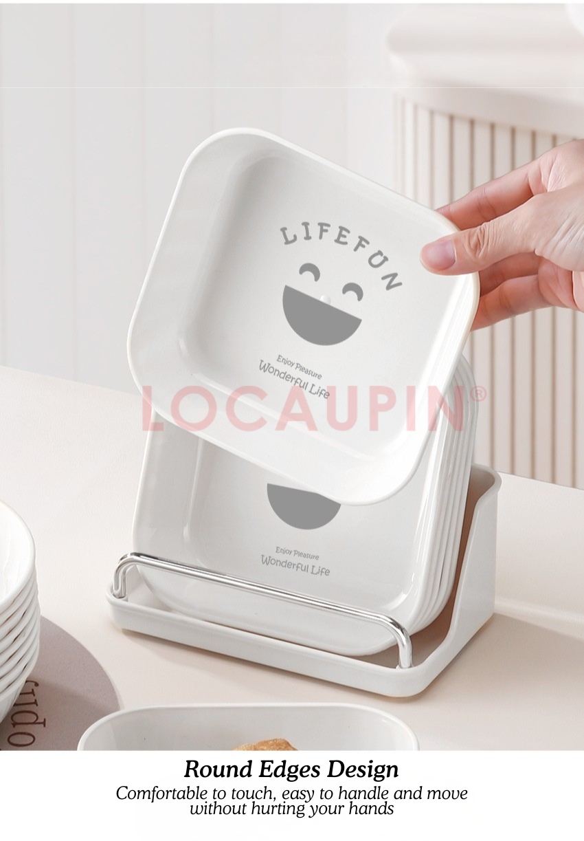 LOCAUPIN 6pcs Plates Set with Plates Storage Organizer Kitchenware Dish Rack Round Square Plastic Plate Dinnerware Set