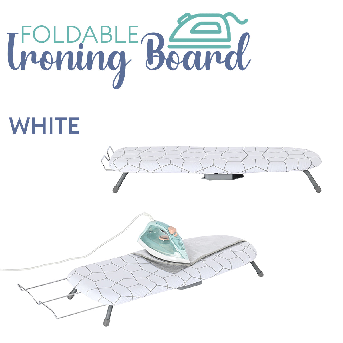 IRON STORAGE- Table Top Folding Ironing Board with Iron holder to help you neatly organize your dorm room and make it look aesthetically pleasing.
