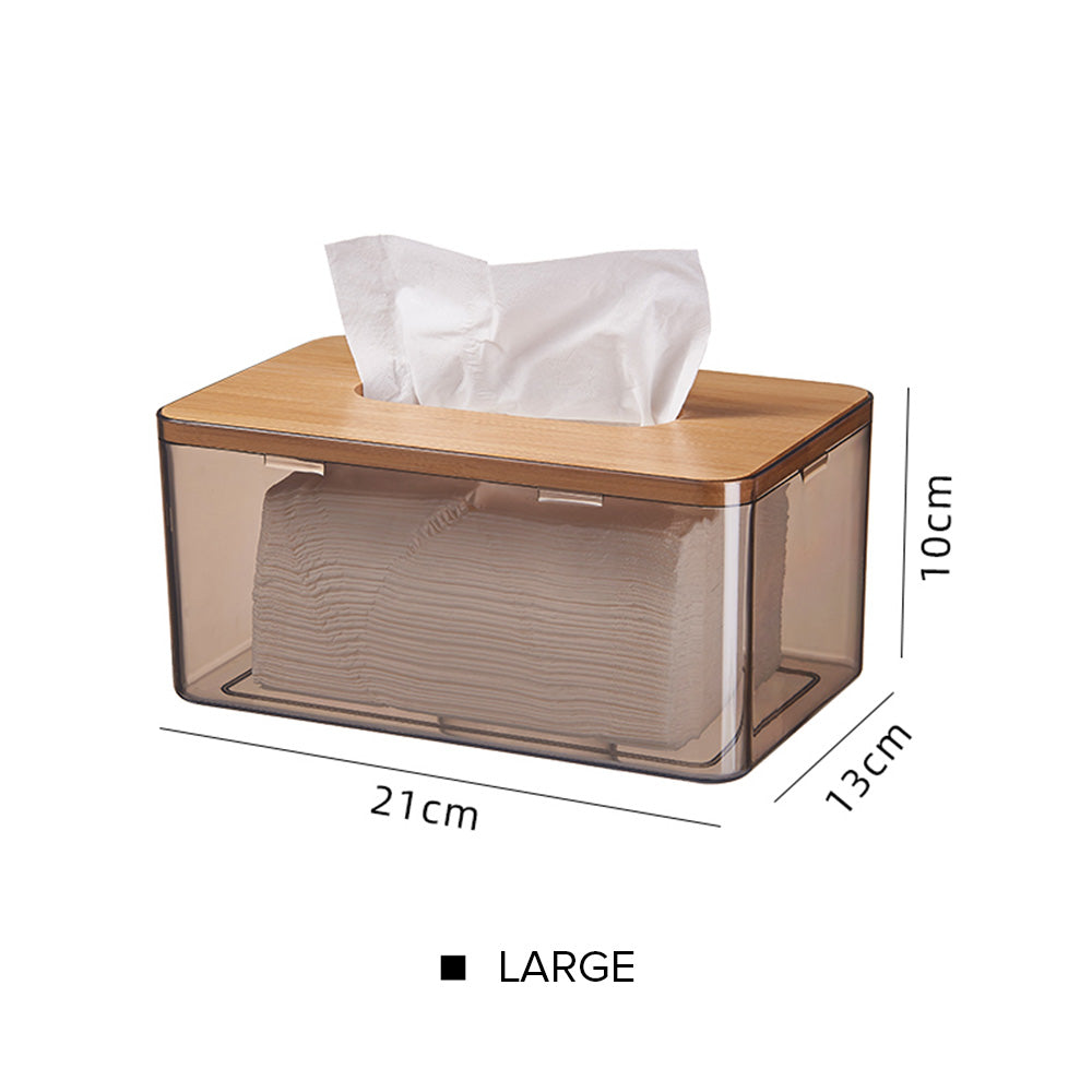 Locaupin Minimalist Clear Tissue Box Dispenser with Bamboo Lid Facial Dryer Sheet Organizer Bathroom Countertop Napkin Holder