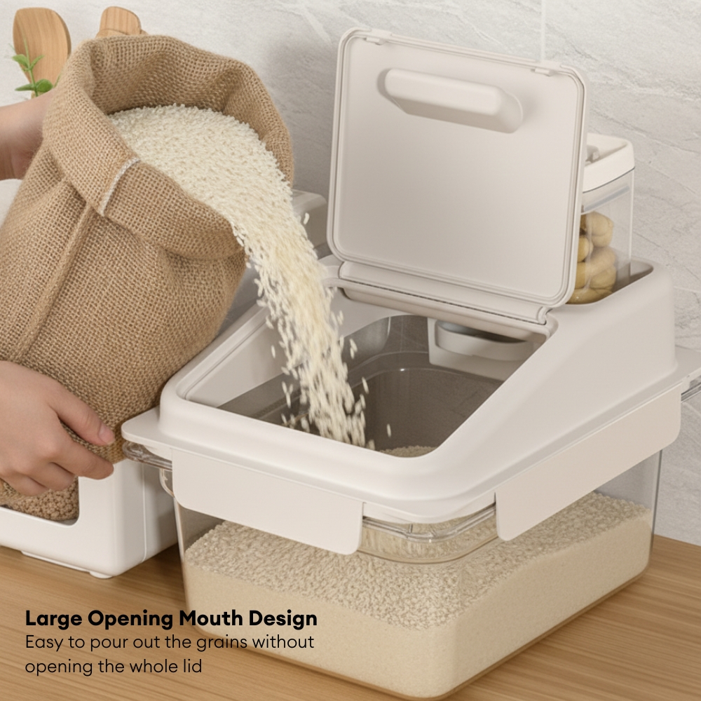 Effortless One-Hand Dispensing: The unique large opening mouth design allows you to pour out the exact amount of grains you need without having to remove the entire lid, offering ultimate convenience during cooking.